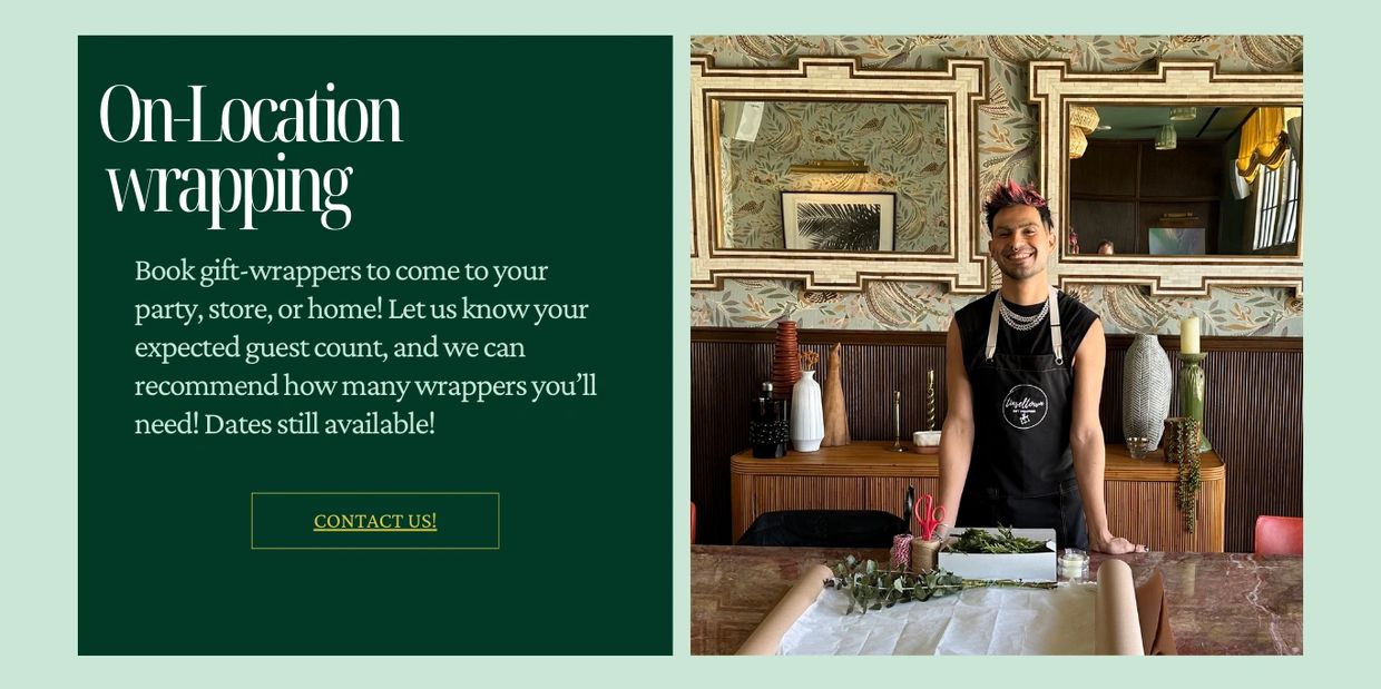 We charge $150 per hour per wrapper for on-location services. This includes the gift-wrappers, plus all materials needed to execute 2-3 wrapping styles of your choice!
